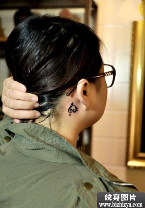 耳后爱心音符刺青图案图片_脖子纹身图案大全_纹身图吧