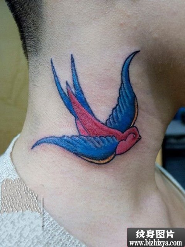 男人脖子彩色燕子刺青图案图片_脖子纹身图案大全_纹身图吧