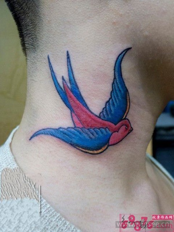 男人脖子彩色燕子刺青_脖子纹身图案大全_纹身图吧