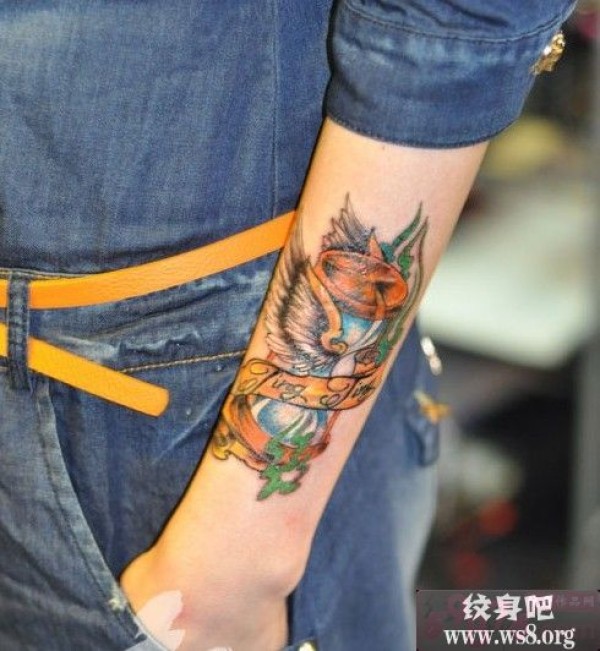 手腕彩色翅膀沙漏纹身图图案_翅膀纹身图案大全_纹身图吧