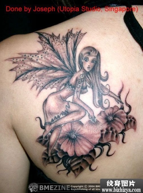 肩后部长发带翅膀的女孩纹身_翅膀纹身图案大全_纹身图吧
