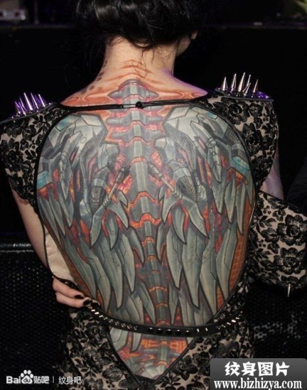 女子后背霸气的机械骨架和翅膀纹身欣赏_翅膀纹身图案大全_纹身图吧