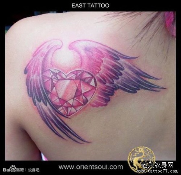 美女肩背时尚漂亮的钻石爱心与翅膀纹身图案_翅膀纹身图案大全_纹身图吧