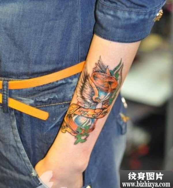 手腕彩色翅膀沙漏纹身图图案图片_翅膀纹身图案大全_纹身图吧