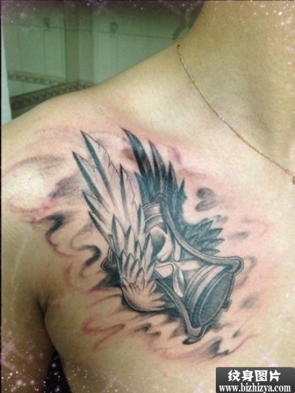 胸前沙漏翅膀纹身图案图片_翅膀纹身图案大全_纹身图吧
