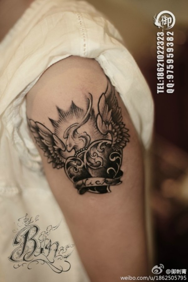 手臂潮流时尚的一款黑灰爱心翅膀纹身图案_翅膀纹身图案大全_纹身图吧