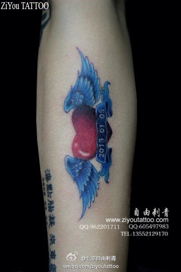 手臂时尚好看的彩色爱心翅膀纹身图案_翅膀纹身图案大全_纹身图吧
