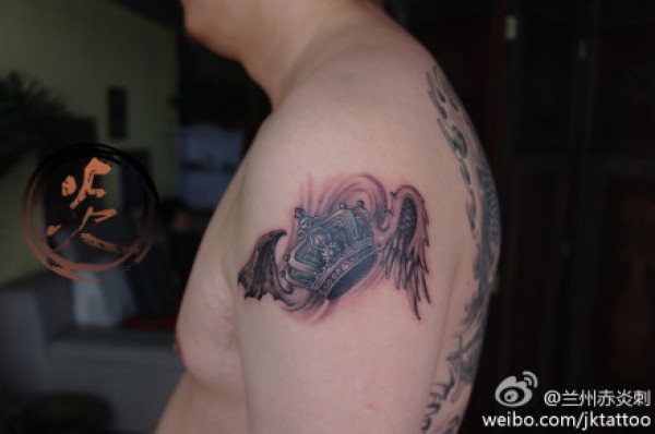 男人手臂经典潮流的皇冠翅膀纹身图案_翅膀纹身图案大全_纹身图吧