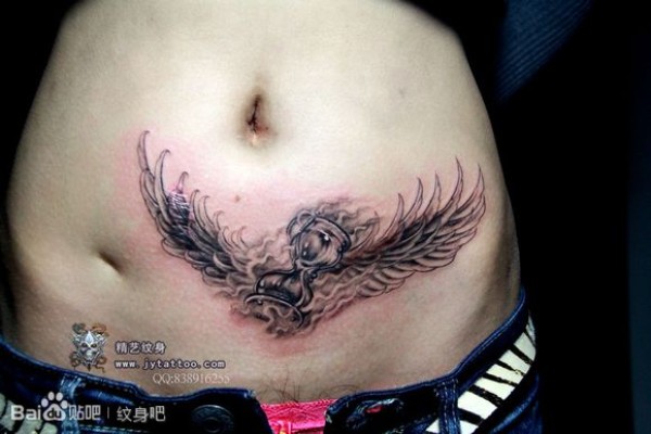 美女腹部时尚经典的沙漏与翅膀纹身图案_翅膀纹身图案大全_纹身图吧