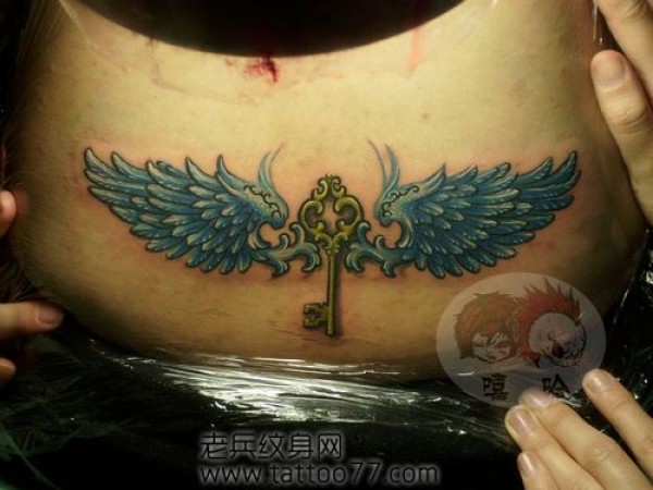 美女腰部一款钥匙与翅膀纹身图案_翅膀纹身图案大全_纹身图吧