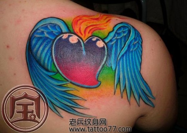 好看的背部彩色爱心翅膀纹身图案_翅膀纹身图案大全_纹身图吧