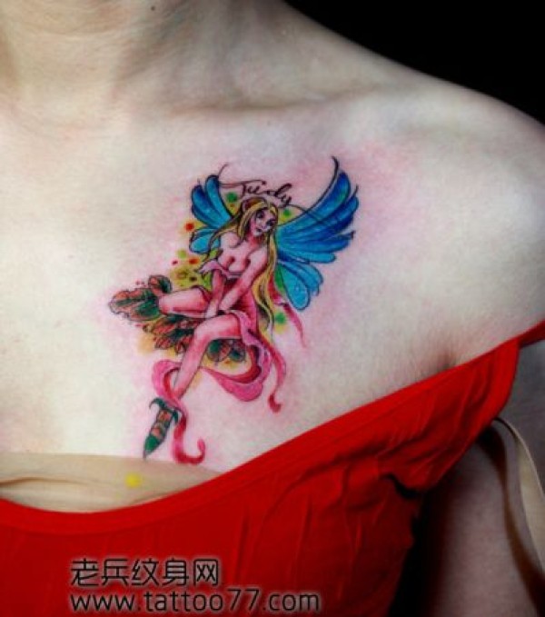 女孩子胸部彩色精灵翅膀纹身图案_翅膀纹身图案大全_纹身图吧