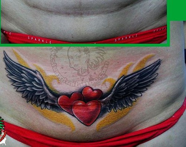 湖北随州文身店腹部爱心翅膀遮盖疤痕纹身图_翅膀纹身图案大全_纹身图吧