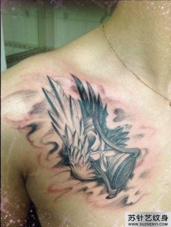 胸前最新沙漏翅膀纹身_翅膀纹身图案大全_纹身图吧