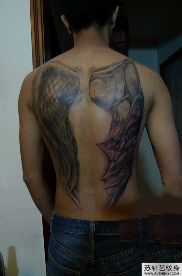 男人背部霸气怪异个性翅膀纹身_翅膀纹身图案大全_纹身图吧
