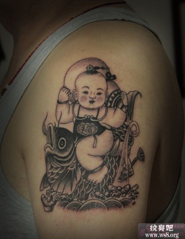 中国传统风童子抱鱼手臂刺青图案_传统纹身图案大全_纹身图吧