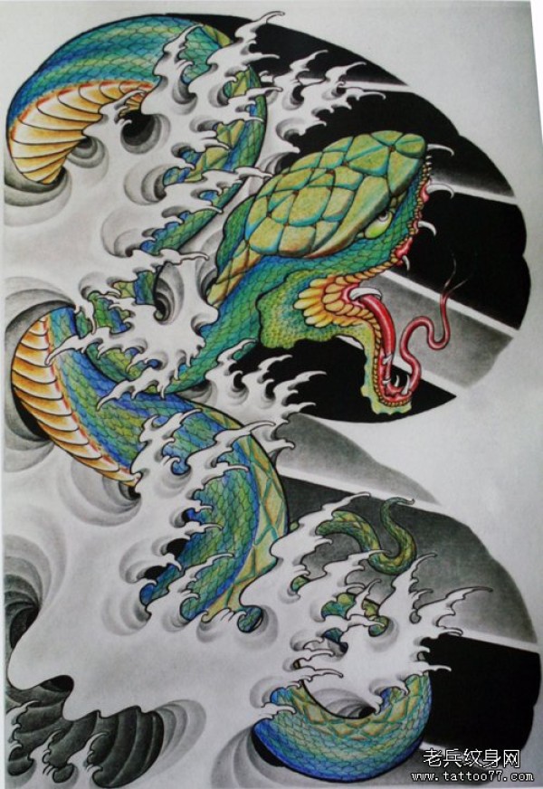推荐一款传统纹身图案之时尚超酷的半胛蛇浪花_传统纹身图案大全_纹身图吧