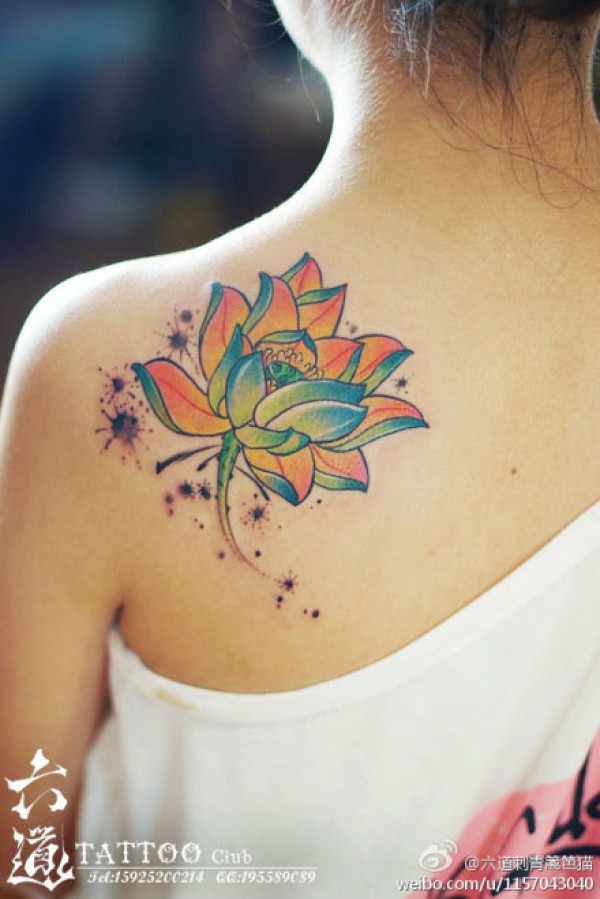 美女后肩背漂亮的彩色传统莲花纹身图案_传统纹身图案大全_纹身图吧