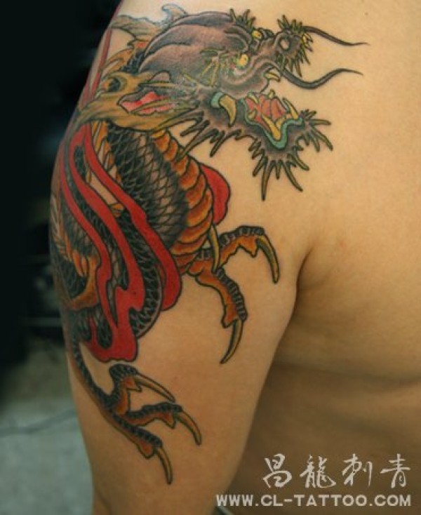 背部过肩龙到手臂彩色传统龙纹身_男士大图_传统纹身图案大全_纹身图吧