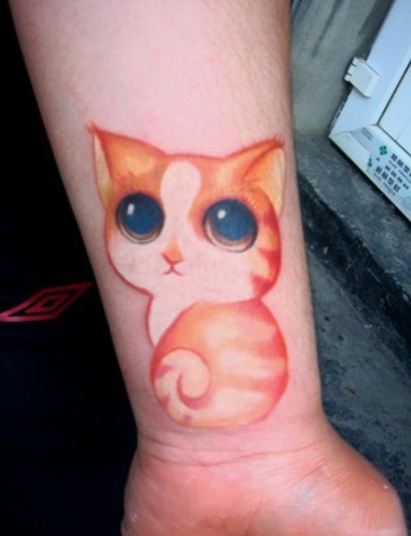 手臂上的大眼红色猫咪图案_动物纹身图案大全_纹身图吧