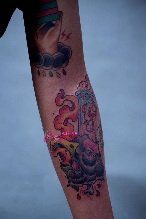 另类花手臂彩色乌鸦纹身_动物纹身图案大全_纹身图吧