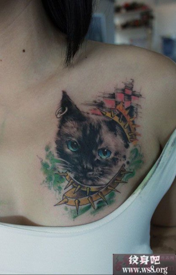 可爱猫咪头像胸部纹身图案_动物纹身图案大全_纹身图吧