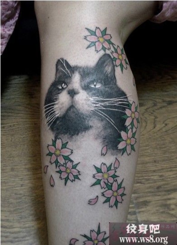 小腿上猫咪和小花纹身图案_动物纹身图案大全_纹身图吧