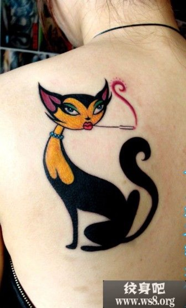 后背个性抽烟猫咪图案_动物纹身图案大全_纹身图吧