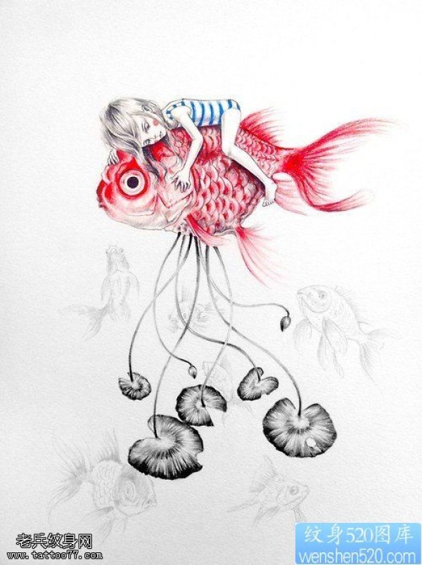 彩色金鱼载着做梦的小女孩游玩_动物纹身图案大全_纹身图吧