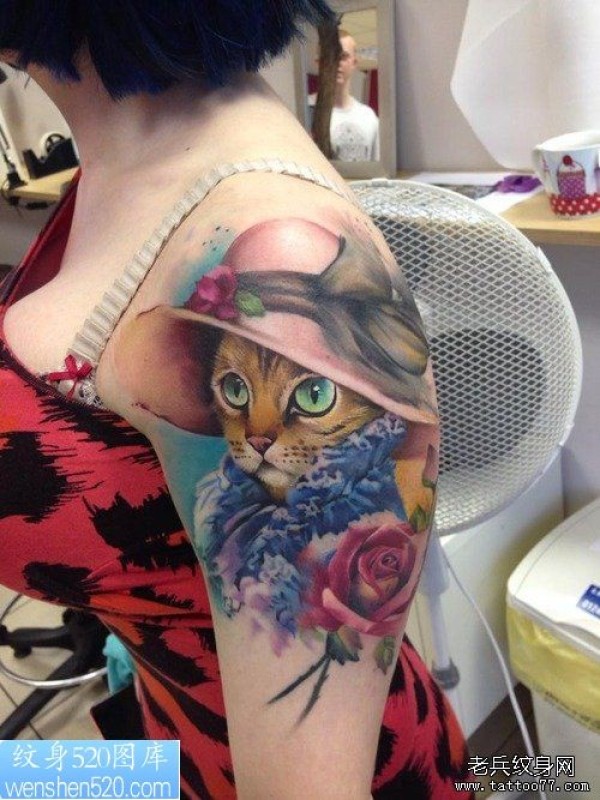 一幅女人胳膊彩色猫咪纹身作品_动物纹身图案大全_纹身图吧