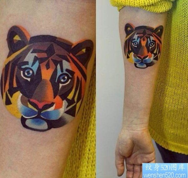 纹身520图库推荐一幅胳膊彩色老虎头文身图片_动物纹身图案大全_纹身图吧