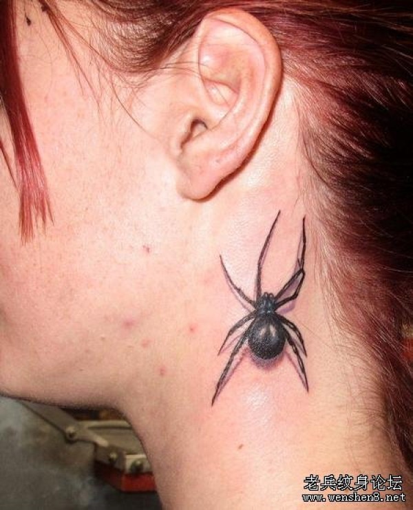 美女颈部黑蜘蛛文身图案图片_动物纹身图案大全_纹身图吧