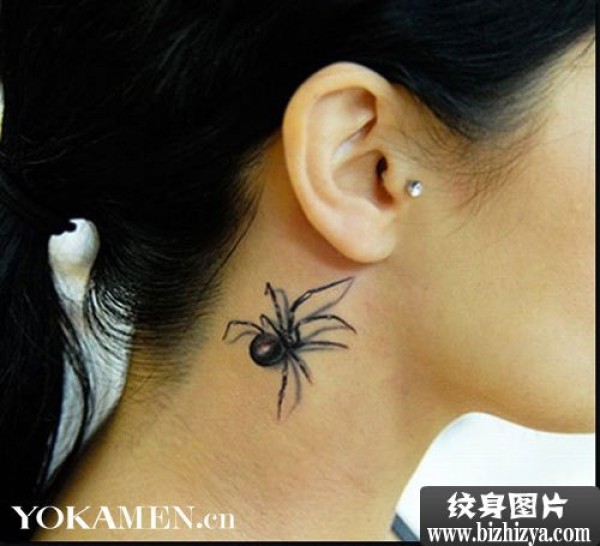 耳根后面的小黑色的蜘蛛图片_动物纹身图案大全_纹身图吧