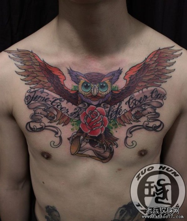 男人前胸超酷的 爱色猫头鹰纹身图案_动物纹身图案大全_纹身图吧