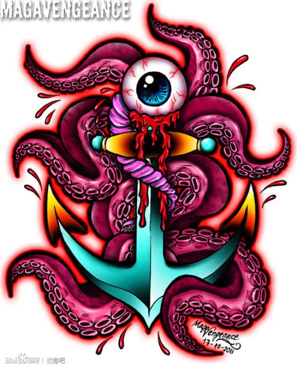很酷潮流的船锚与章鱼纹身图案_动物纹身图案大全_纹身图吧