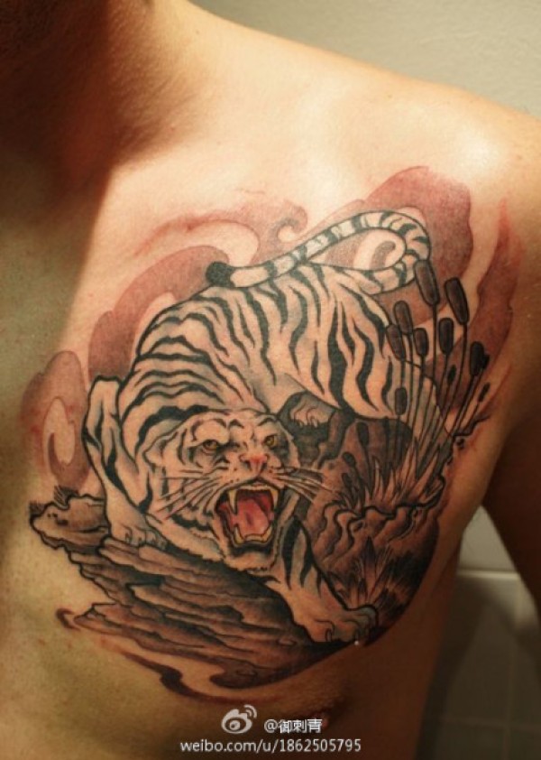 男人前胸霸气潮流的老虎纹身图案_动物纹身图案大全_纹身图吧