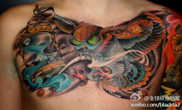 男人前胸超帅的猫头鹰与沙漏纹身图案_动物纹身图案大全_纹身图吧