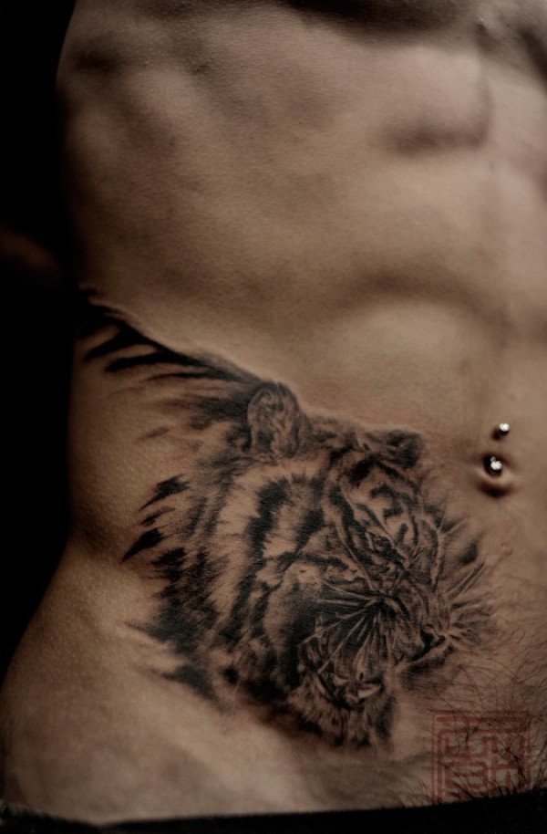 男人腹部经典霸气的虎头纹身图案_动物纹身图案大全_纹身图吧