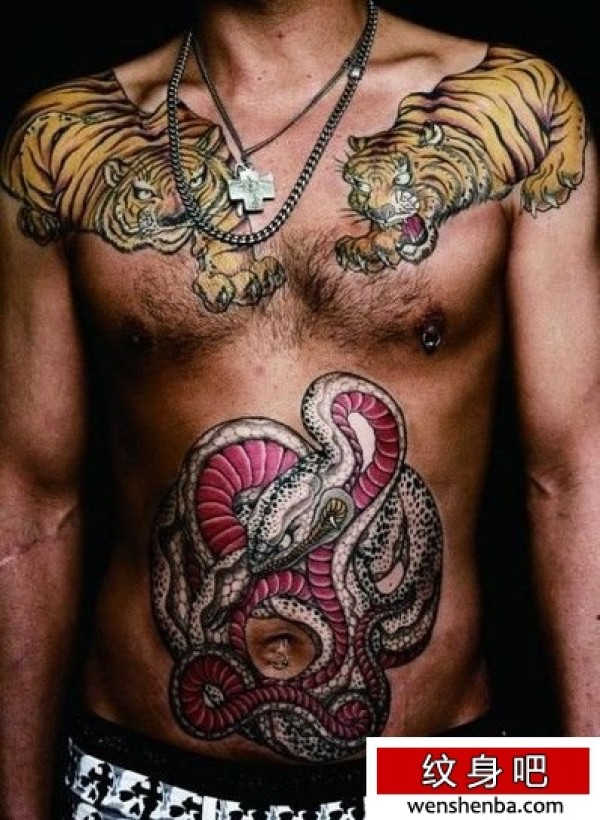 凶猛的老虎和蛇纹身图案_动物纹身图案大全_纹身图吧