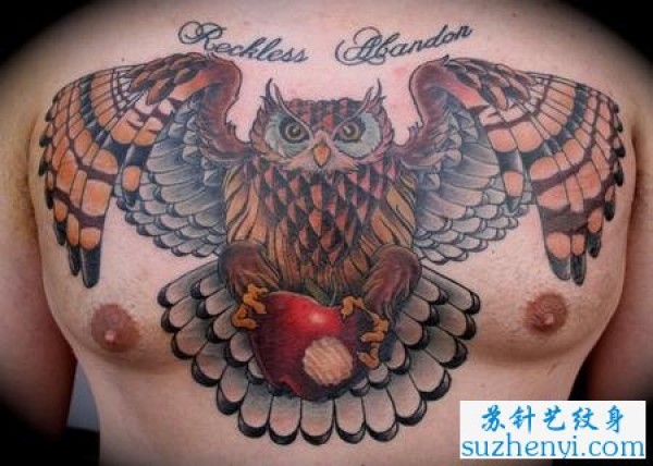前胸彩色猫头鹰纹身_动物纹身图案大全_纹身图吧