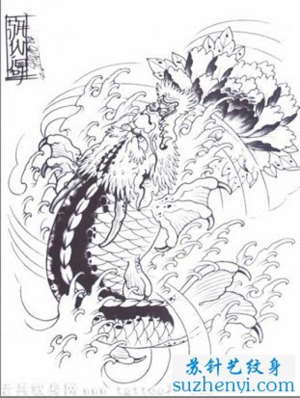 凶猛的鳌鱼牡丹纹身_动物纹身图案大全_纹身图吧