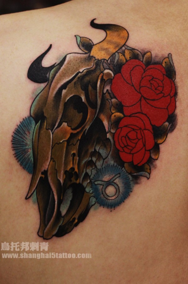 牛头骨茶花_动物纹身图案大全_纹身图吧