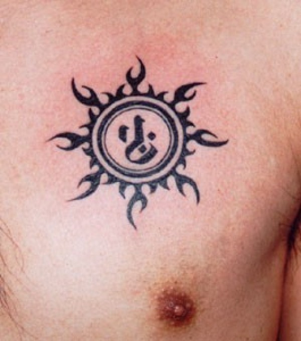 精致的胸口图腾太阳梵文纹身图片作品_梵文纹身图案大全_纹身图吧