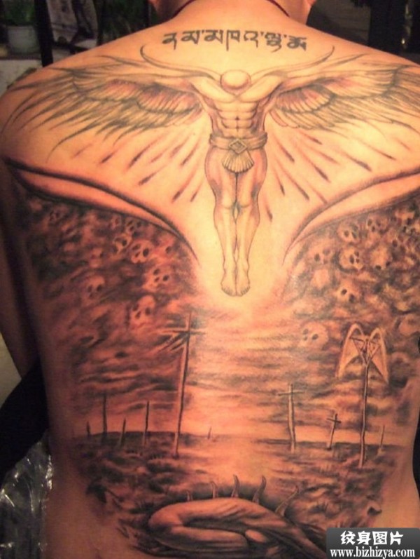 满背霸气的骷髅天使和梵文刺青纹身_梵文纹身图案大全_纹身图吧