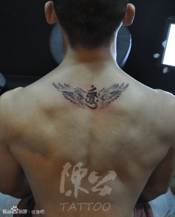 男生后背经典时尚的翅膀与梵文纹身图案_梵文纹身图案大全_纹身图吧
