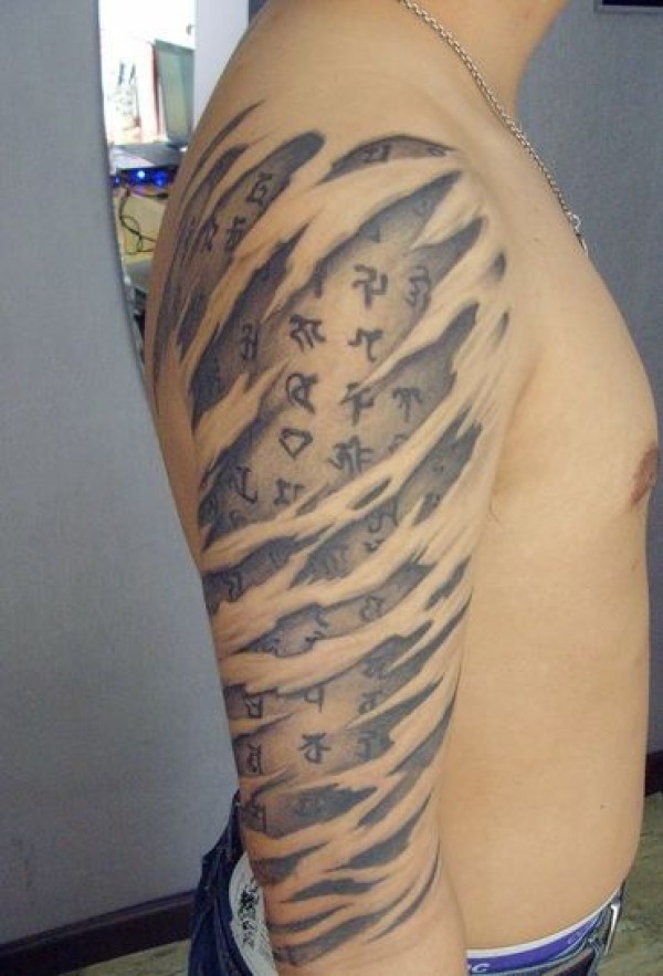 经典的大臂撕皮效果梵文纹身图案_梵文纹身图案大全_纹身图吧