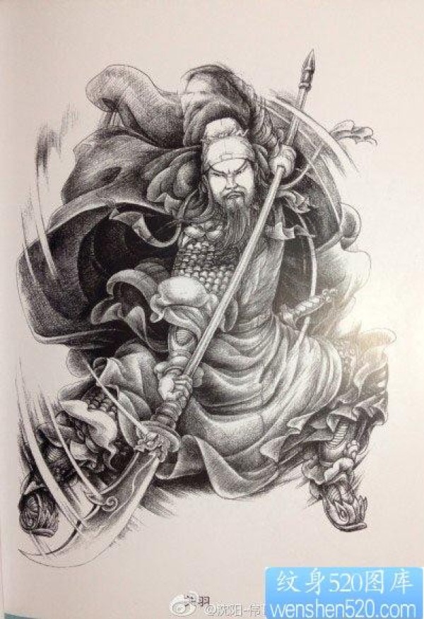 一幅霸气很酷的关公耍大刀纹身手稿_关公纹身图案大全_纹身图吧