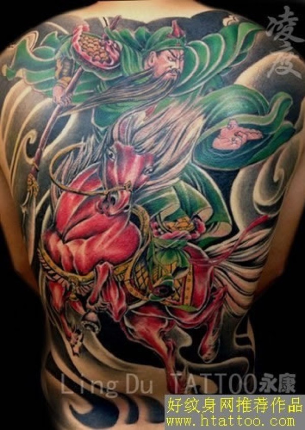 红色骏马上的关羽满背部作品图_关公纹身图案大全_纹身图吧
