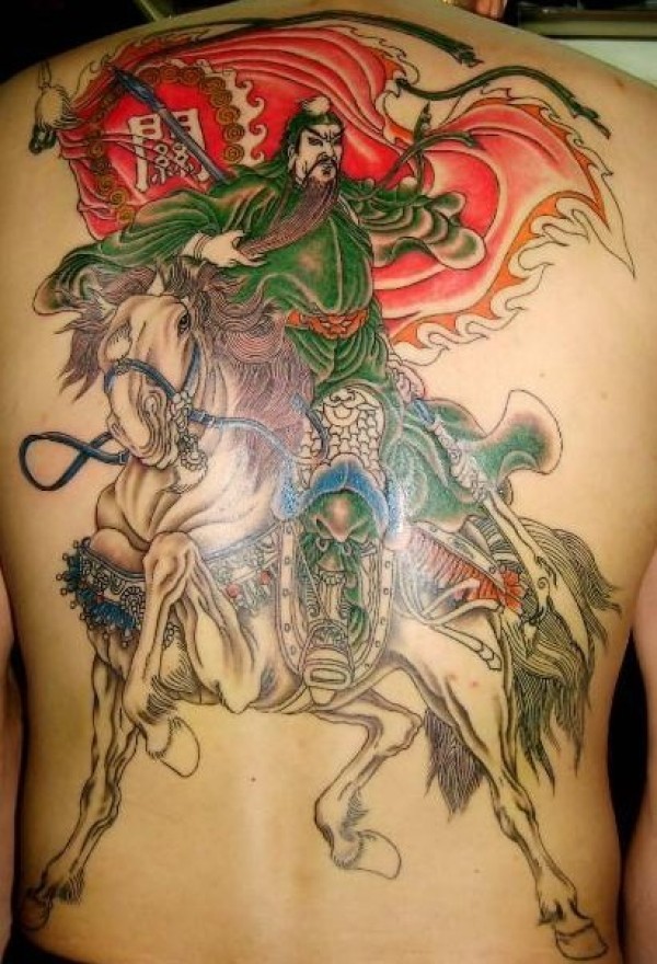 红色骏马上的关羽满背部作品图_关公纹身图案大全_纹身图吧