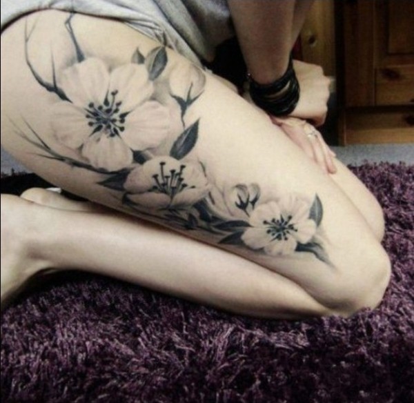 女生腿部黑白个性梅花传统纹身_黑白纹身图案大全_纹身图吧